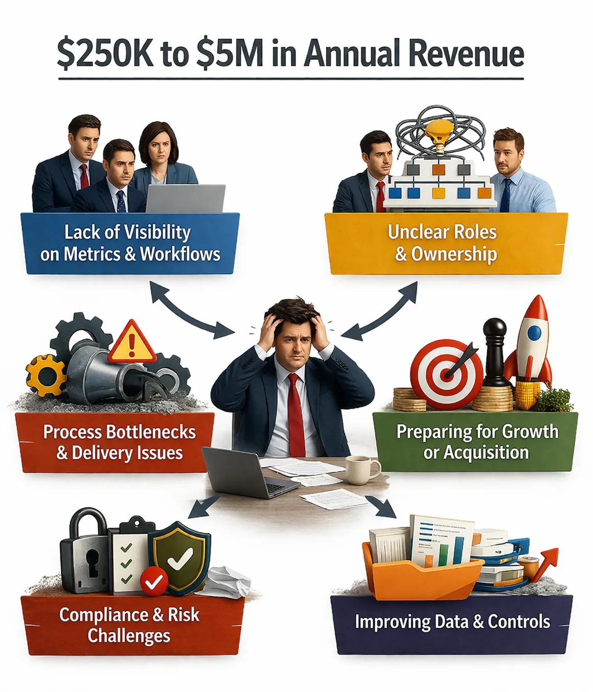 Are generating approximately $250k to $5m+ in annual revenue but struggling to scale operations